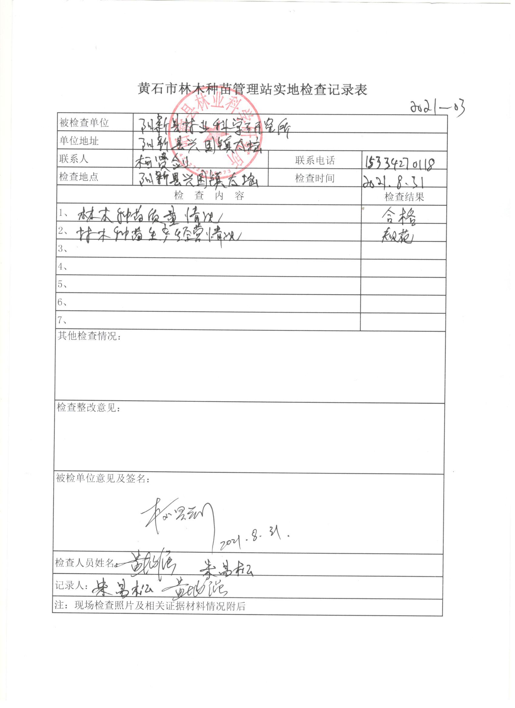 黄石市林木种苗管理站实地检查记录表(2021-08-31)