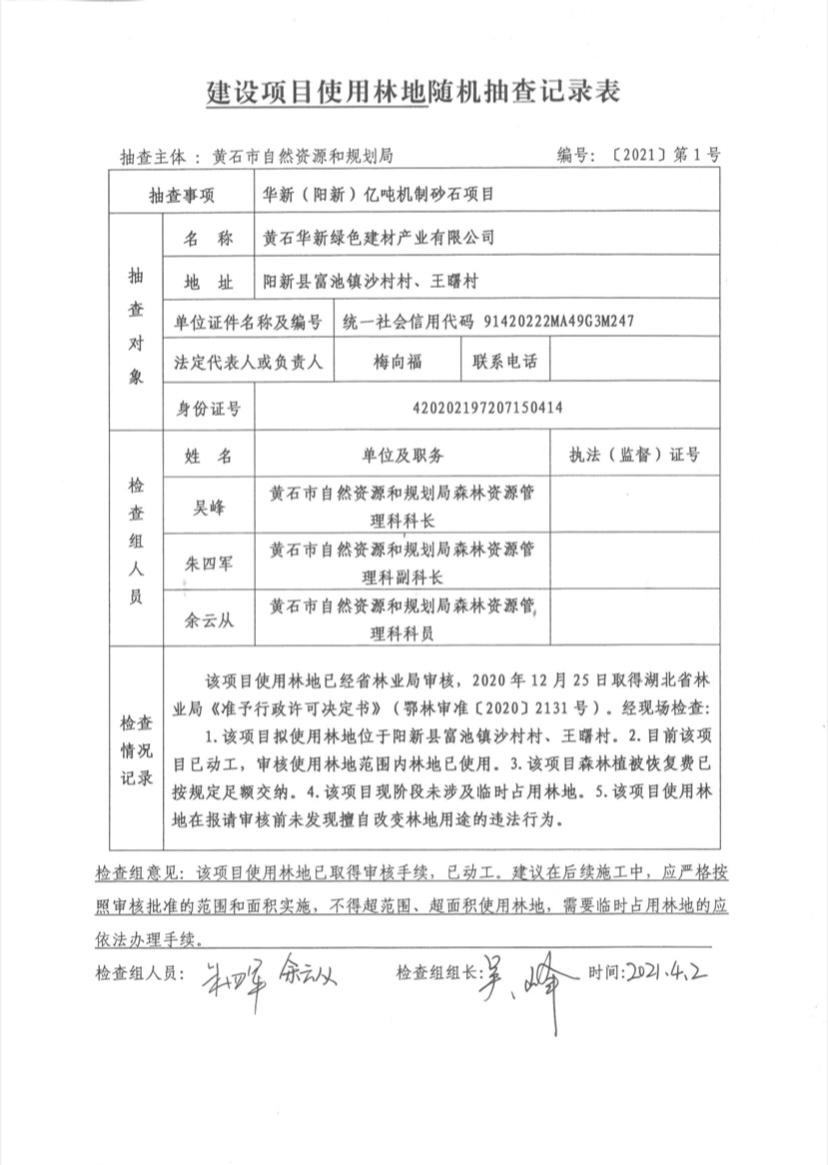建设项目使用林地随机抽查记录表 [2021]1号