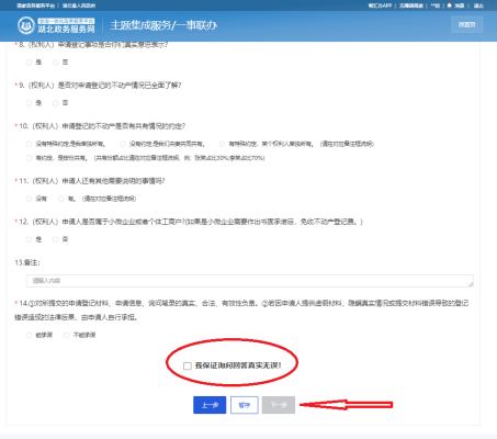 填写询问笔录,勾选“我保证询问回答真实无误”,进入下一步