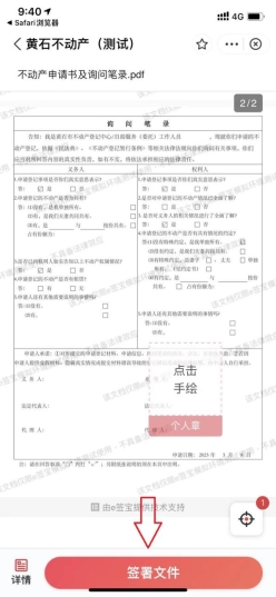 打开申请书文件后,申请人查看确认无误后点击【点击手绘】按钮或者【签署文件】按钮,手机屏幕上会弹出签名框,由申请人完成签名后,电子签名会在申请书对应的人员类型后面显示。