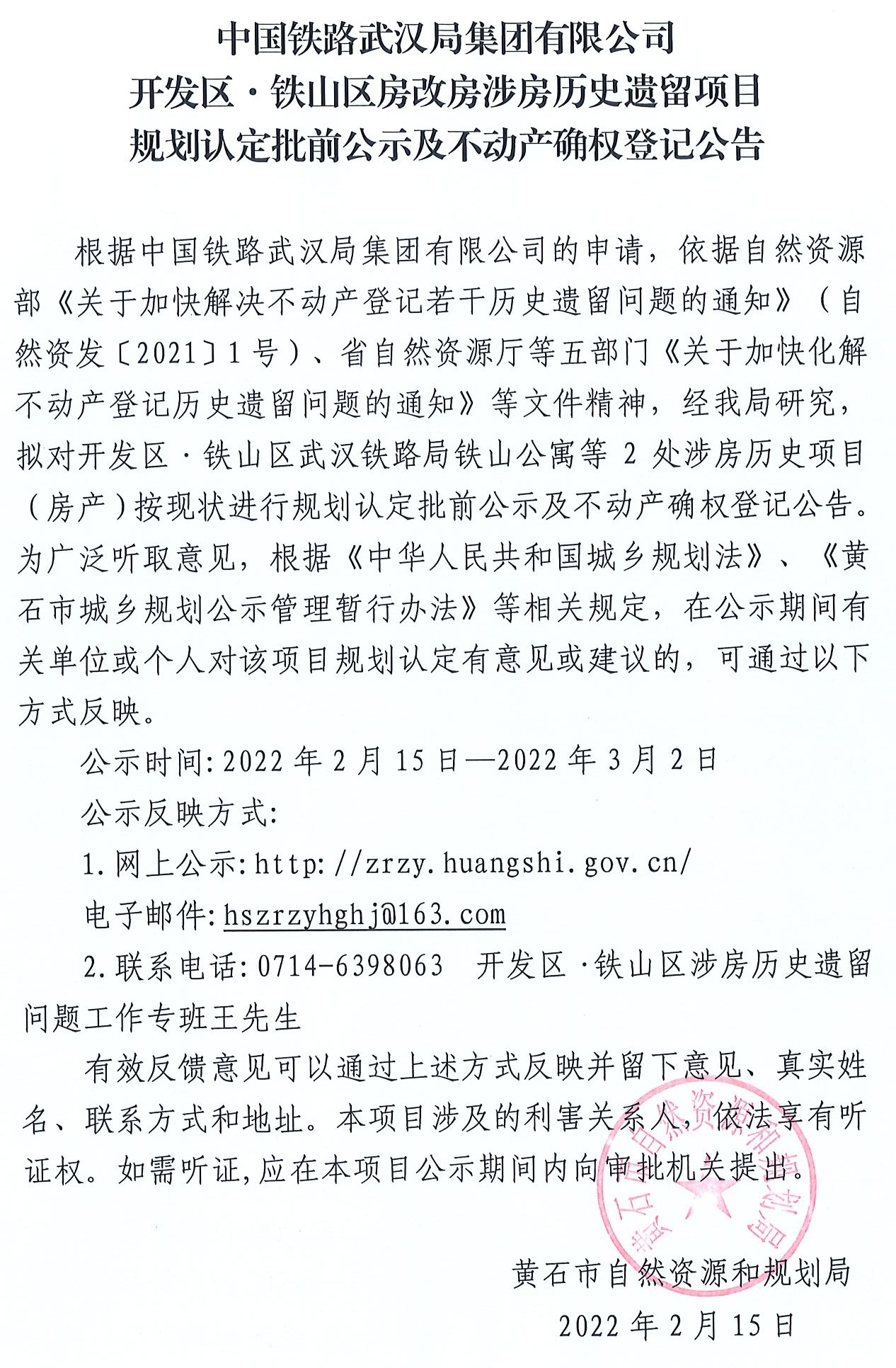 中国铁路武汉局集团有限公司 开发区·铁山区房改房涉房历史遗留项目规划认定批前公示及不动产确权登记公告
