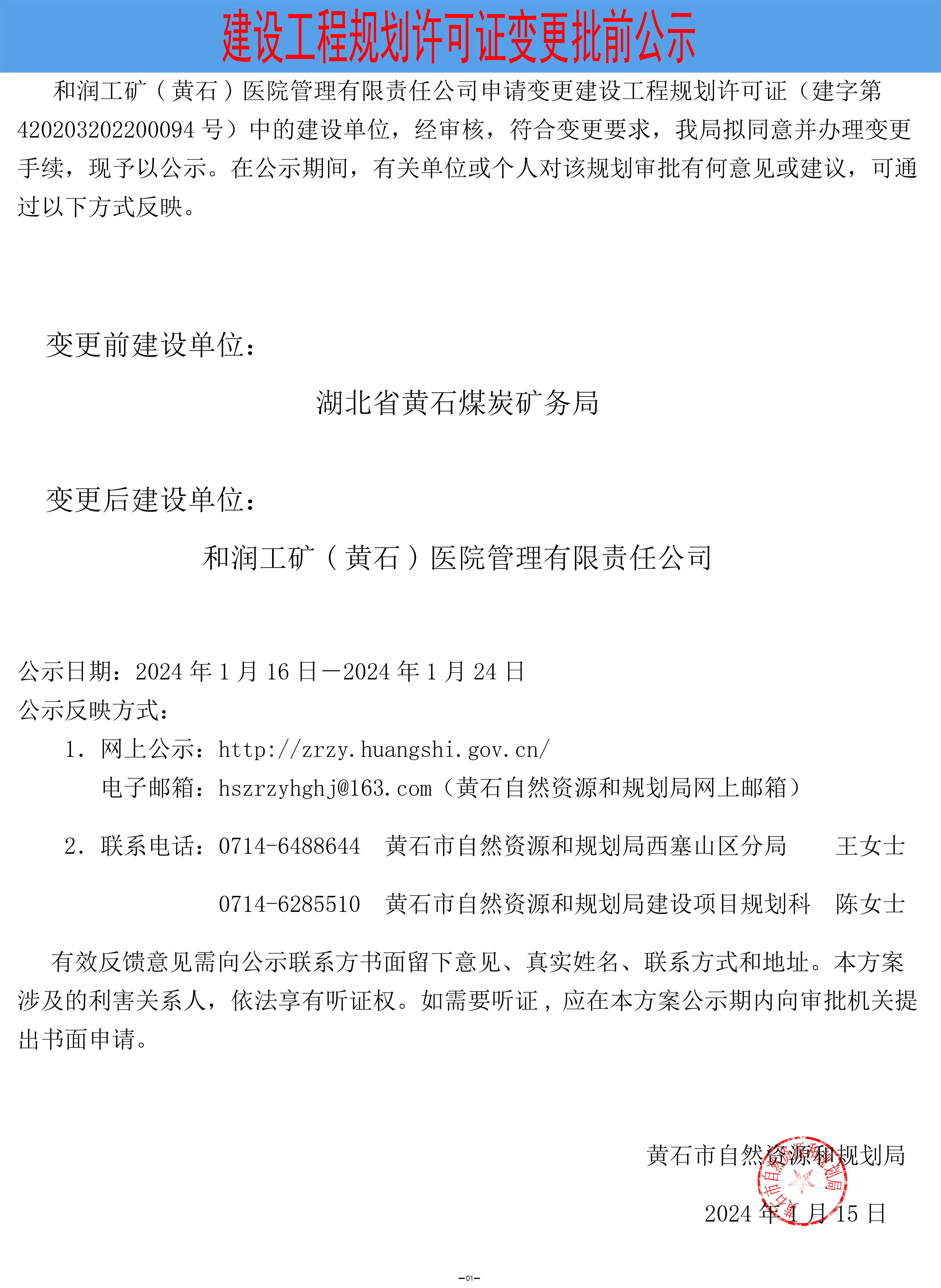 和润工矿(黄石)医院管理有限责任公司申请变更建设工程规划许可证(建字第420203202200094号)中的建设单位,经审核,符合变更要求,我局拟同意并办理变更手续,现予以公示。