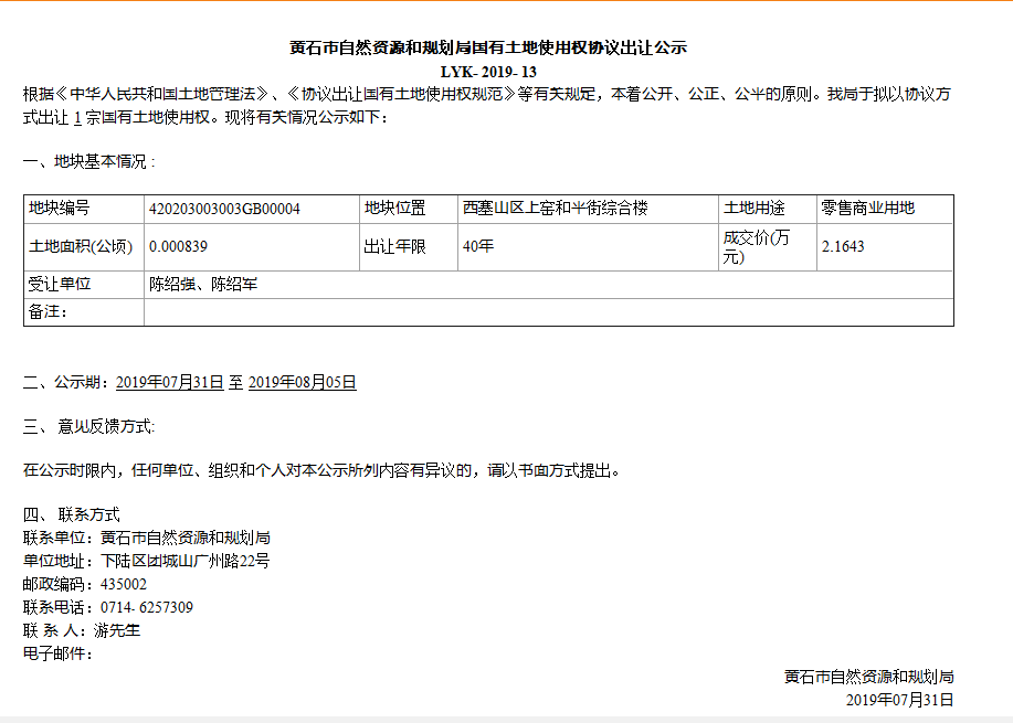 黄石市自然资源和规划局国有土地使用权协议出让公示LYK-2019-13