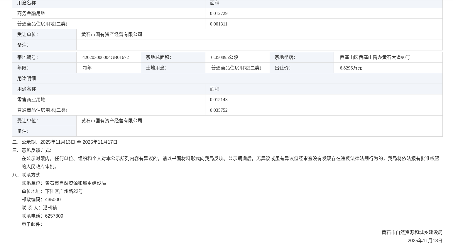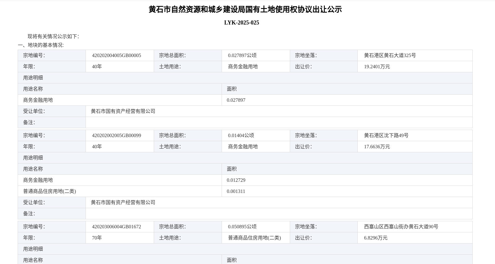 黄石市自然资源和城乡建设局国有土地使用权协议出让公示 LYK-2025-025