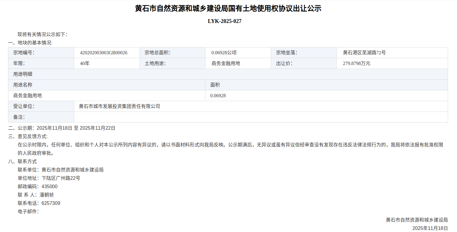 黄石市自然资源和城乡建设局国有土地使用权协议出让公示 LYK-2025-027