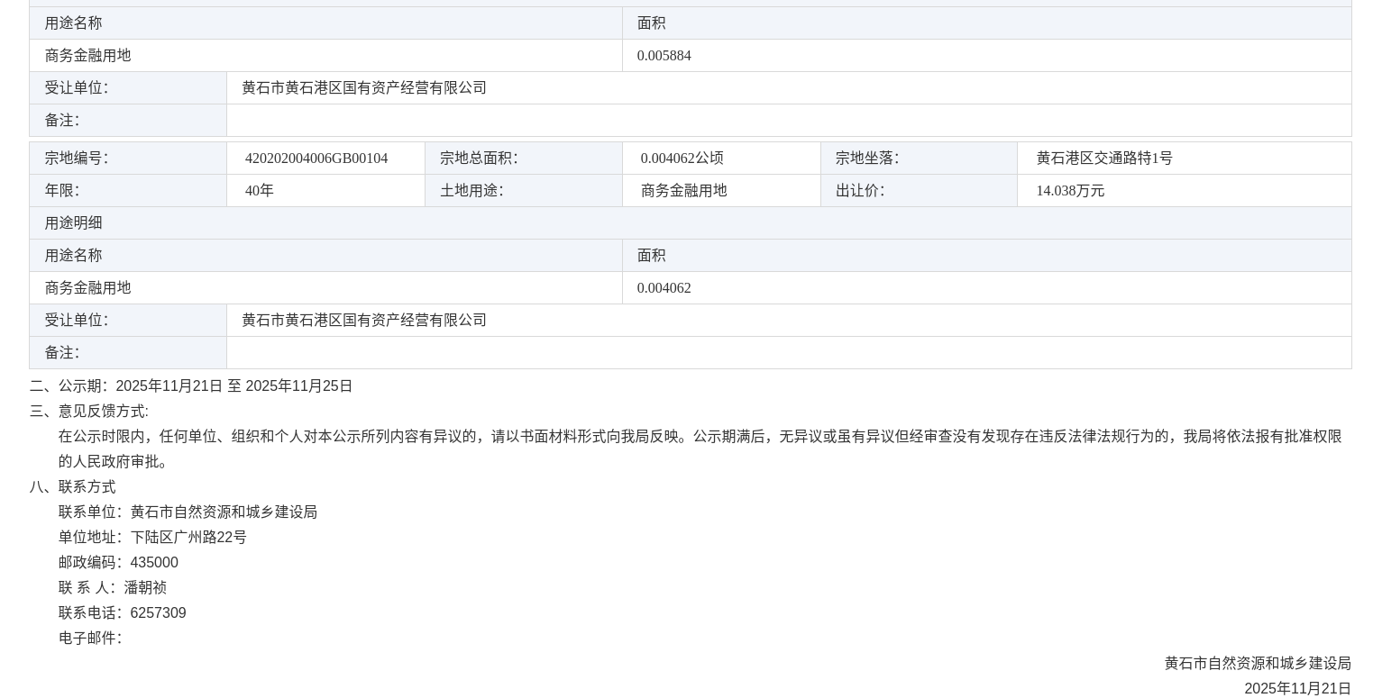 黄石市自然资源和城乡建设局国有土地使用权协议出让公示 LYK-2025-030