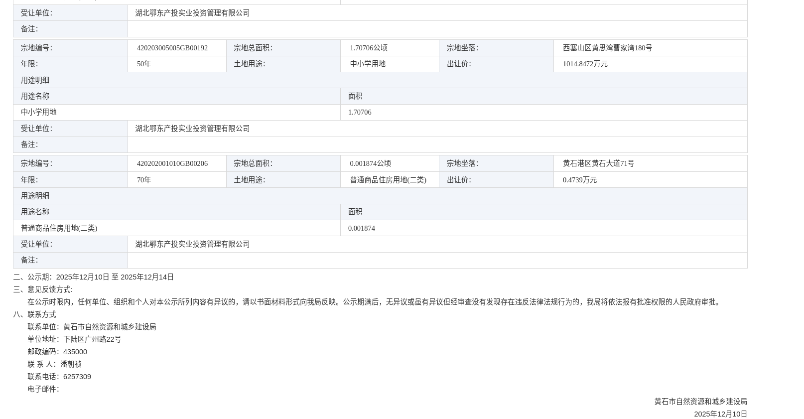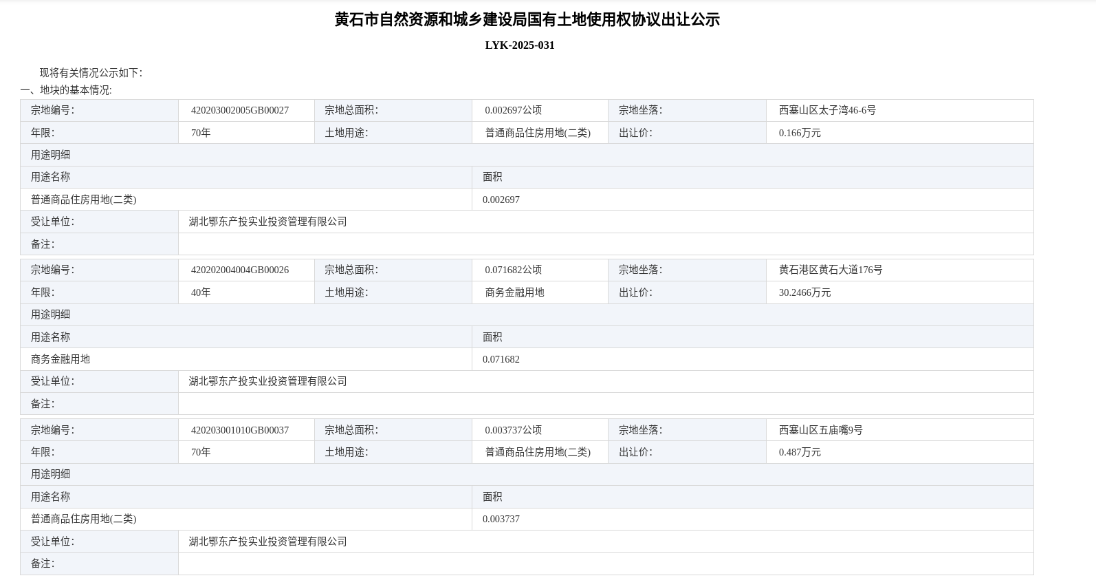黄石市自然资源和城乡建设局国有土地使用权协议出让公示 LYK-2025-031