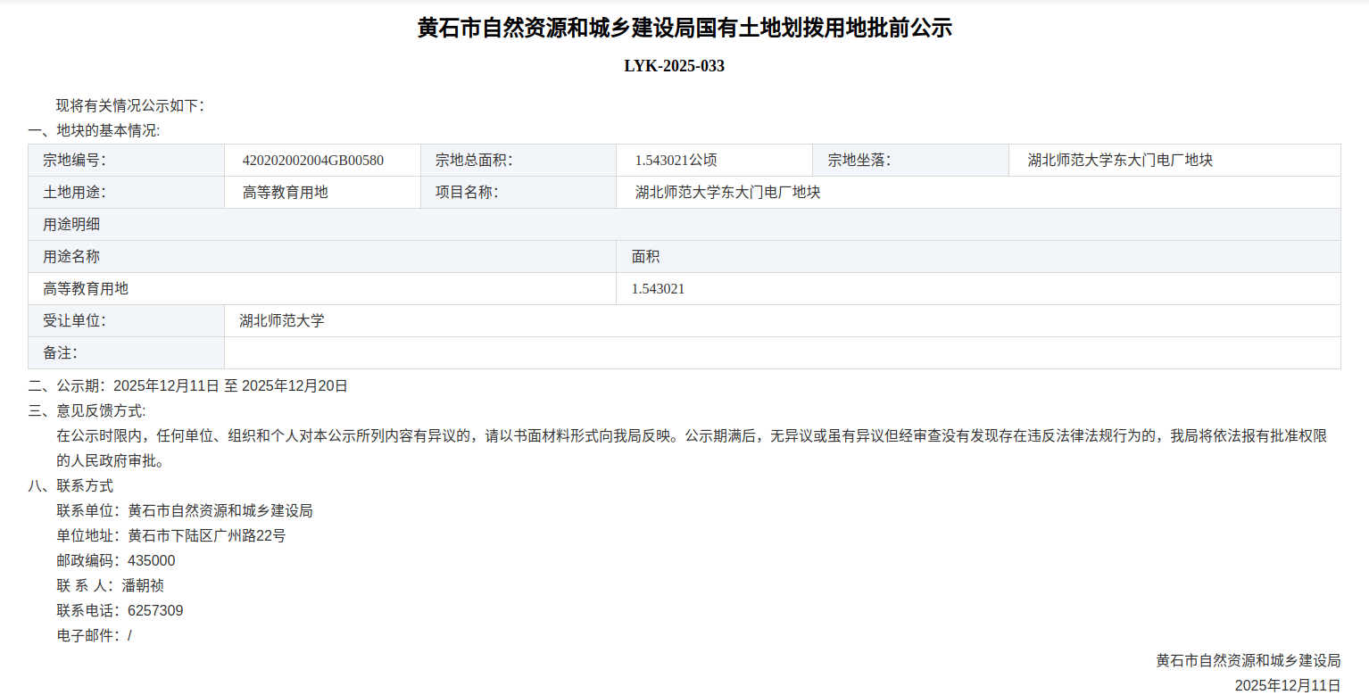 黄石市自然资源和城乡建设局国有土地划拨用地批前公示 LYK-2025-033