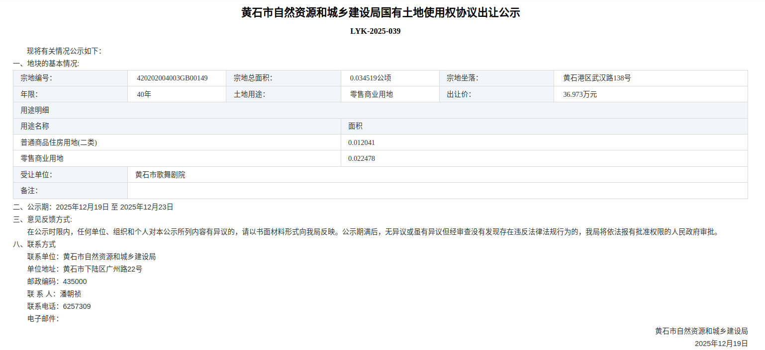 黄石市自然资源和城乡建设局国有土地使用权协议出让公示 LYK-2025-039