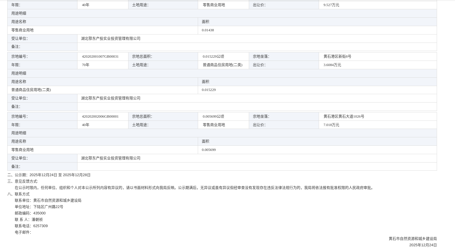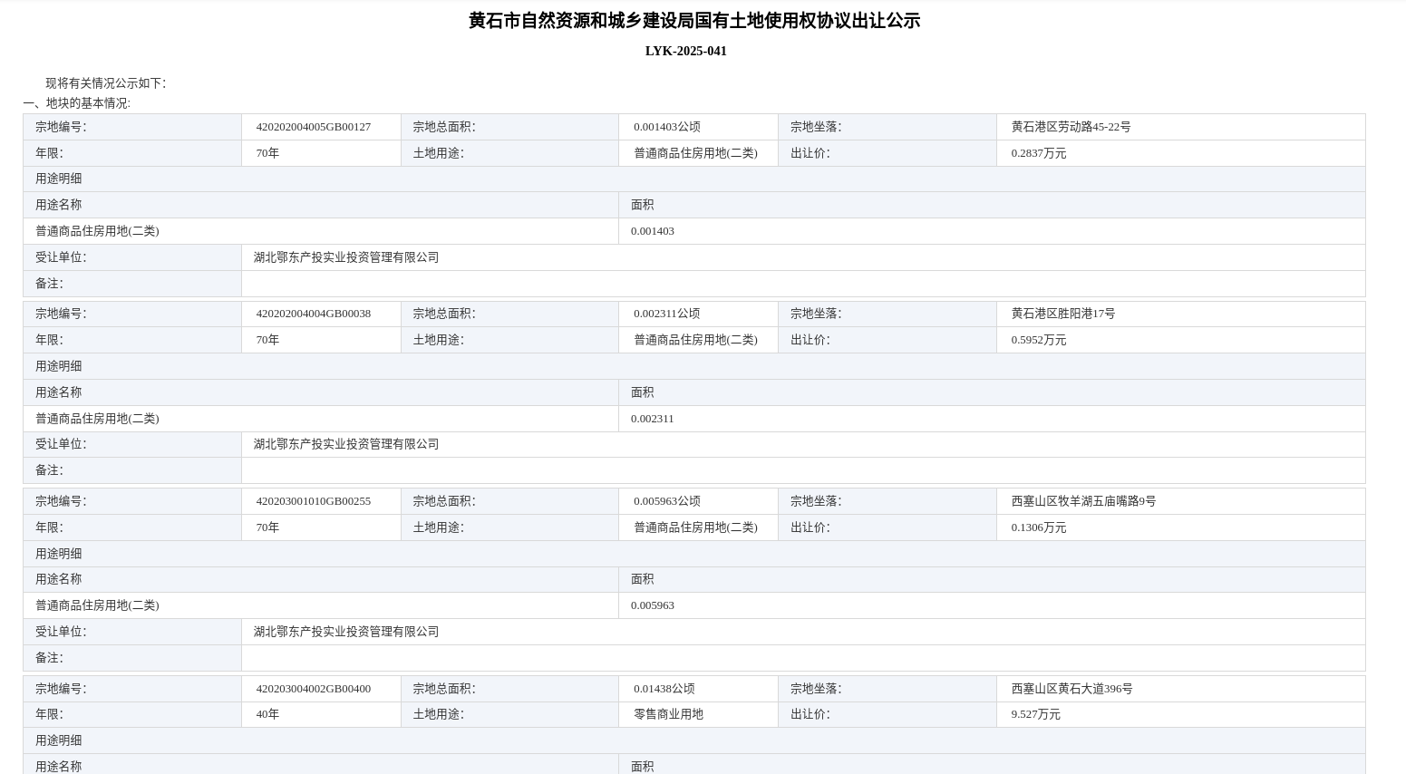 黄石市自然资源和城乡建设局国有土地使用权协议出让公示 LYK-2025-041