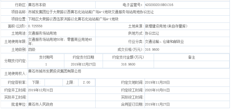 市城发集团位于大泉路以西黄石北站站前广场A-1地块交通服务场站用地协议出让