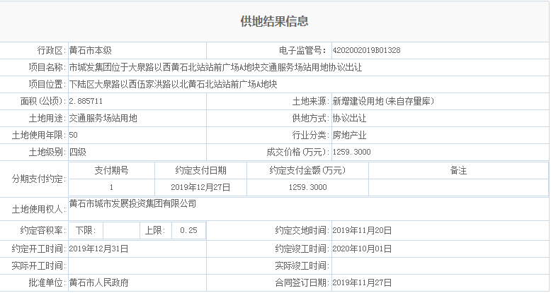 市城发集团位于大泉路以西黄石北站站前广场A地块交通服务场站用地协议出让