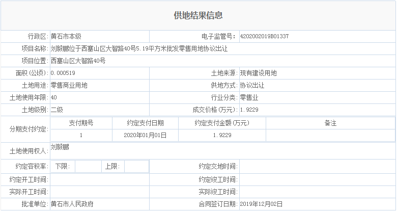 刘毅鹏位于西塞山区大智路40号5.19平方米批发零售用地协议出让