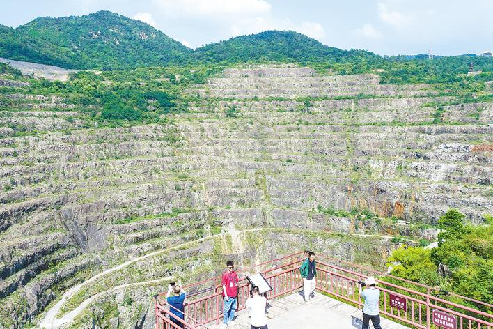 “十一”长假,黄石“亚洲第一天坑”旁,国家矿山公园游人如织,曾经岩石裸露的黄荆山麓,如今草木葱茏,孩童在草坪上嬉戏奔跑。长江之滨,黄石这座因矿而生、依矿而兴的老工业城市,正经历着一场深刻的绿色蝶变。