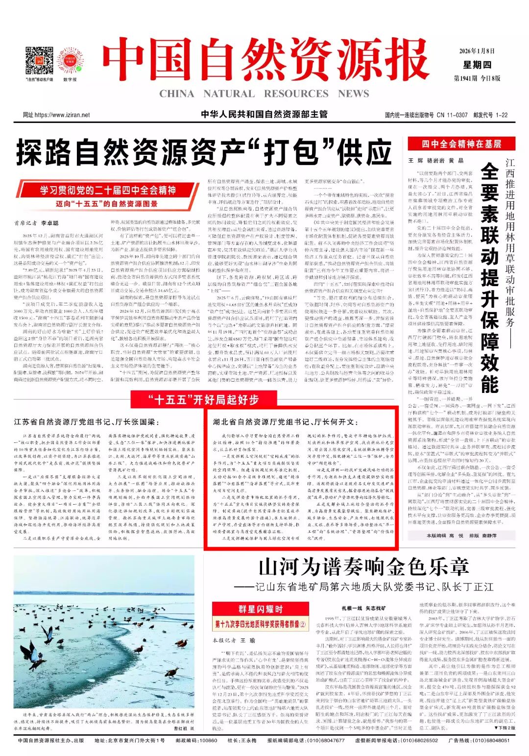1月8日《中国自然资源报》头版刊登《“十五五”开好局起好步》专题报道。湖北省自然资源厅党组书记、厅长何开文谈2026年全国自然资源工作会议精神落实举措。