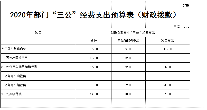 财政批复全局2020年部门“三公”经费预算合计65万元,其中:公务接待费17万元(商品和服务支出10万元,项目支出7万元),公务用车运行费36万元(商品和服务支出32万元,项目支出4万元),因公出国(境)费用12万元(商品和服务支出12万元)。