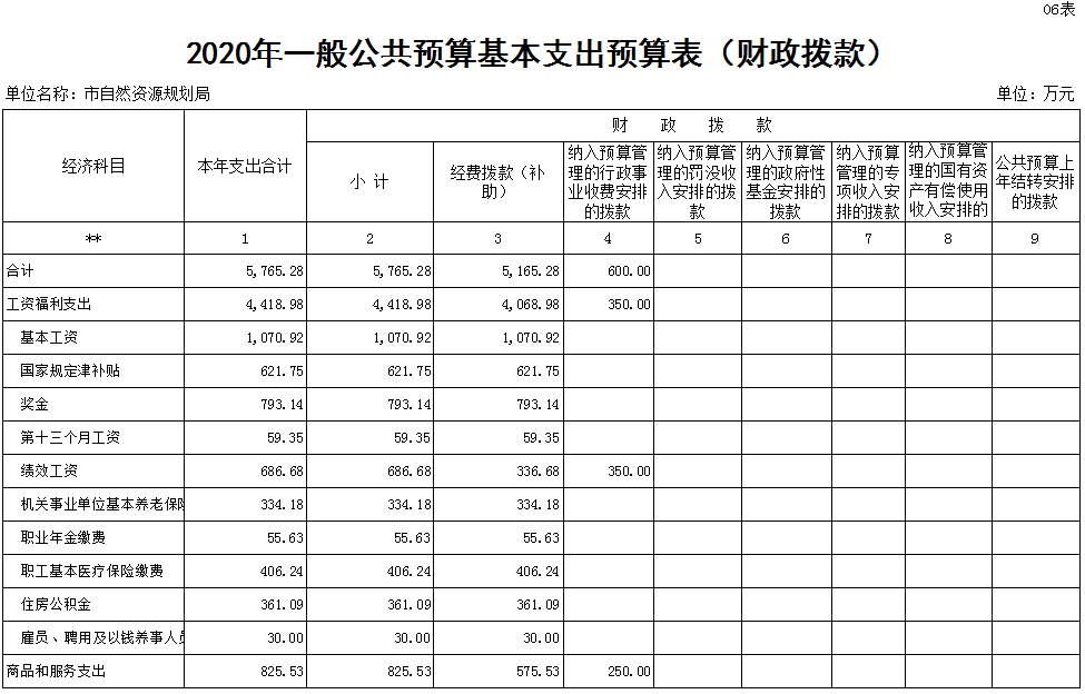 2020年全局预算支出5765.28万元。其中:工资福利支出4418.98万元,商品和服务支出825.53万元,对个人和家庭补助支出520.77万元,项目支出2164万元。
