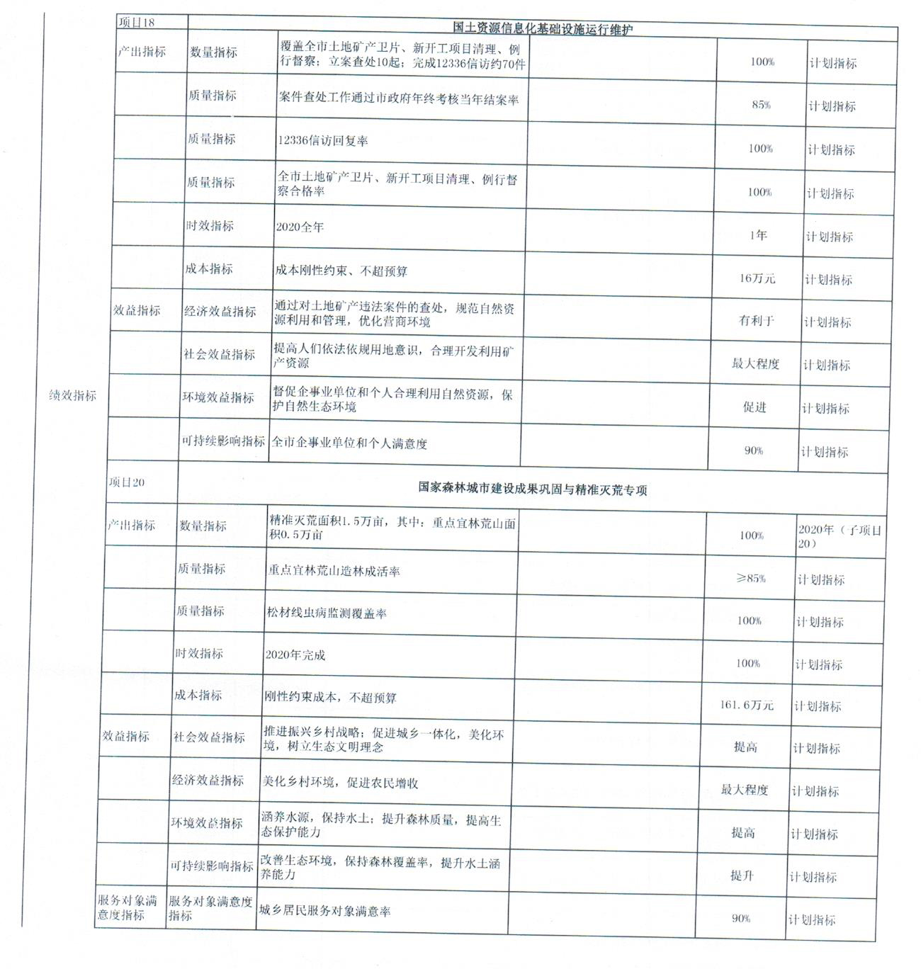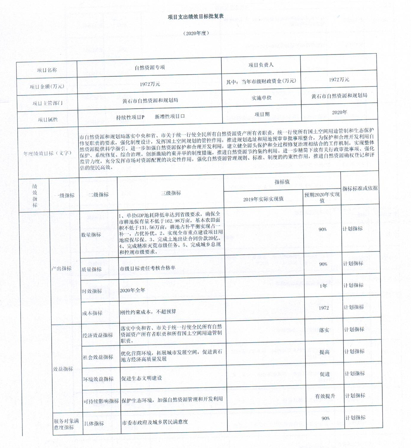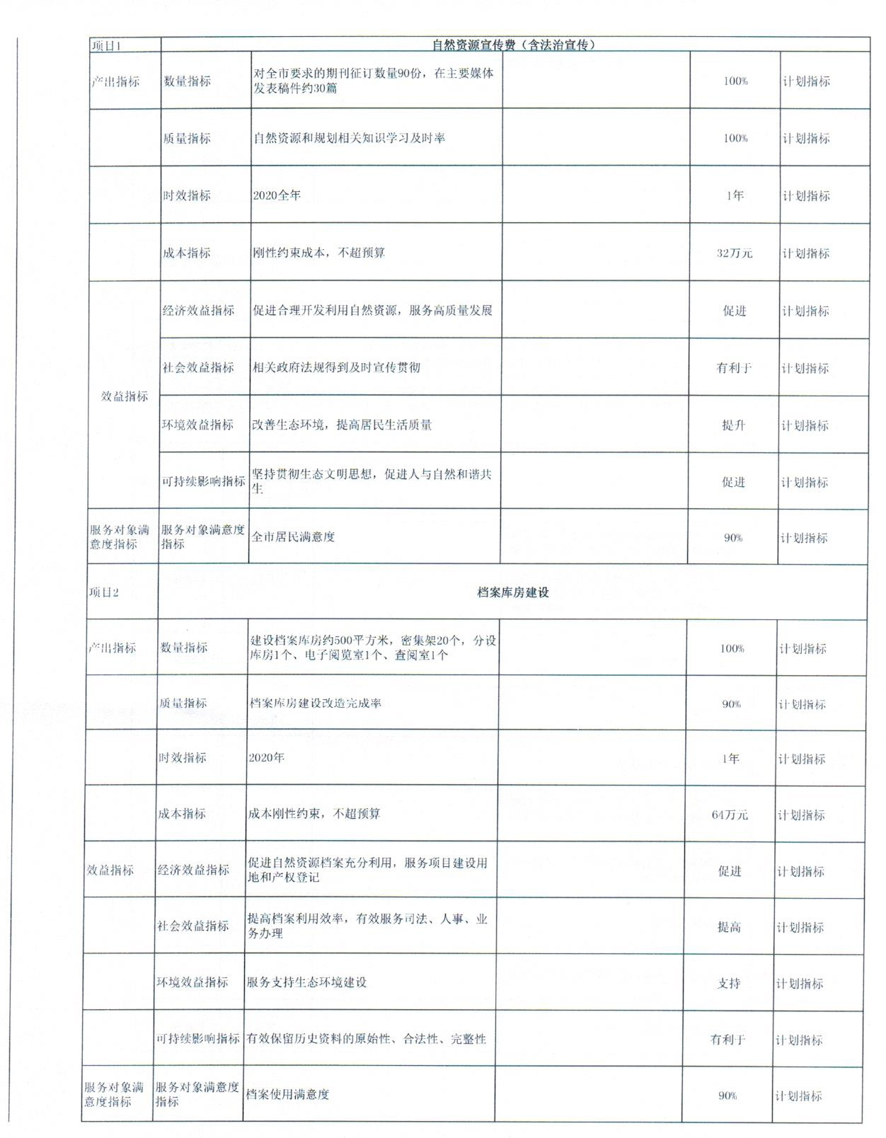 2020年部门项目预算绩效目标已经批复。单项金额50万元以上的项目共2项,其中:局机关1项,为自然资源专项工作经费1972万元,市不动产登记中心项目1项,为不动产登记运行维护费192万元。