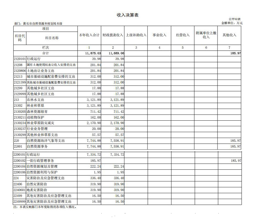 市自然资源和规划局(本级)决算依据统一核算的市自然资源和规划局账套数据进行编报。统一核算单位包括:黄石市自然资源和规划局(黄石市林业局)机关、黄石市自然资源和规划局黄石港区分局、黄石市自然资源和规划局西塞山区分局、黄石市自然资源和规划局下陆区分局、市自然资源权益和维护中心、市国土整治办公室、市土地储备中心、市地勘基金中心、市国土信息中心、市规划展示馆、市城市规划研究信息中心、市森林植物检疫站、市木材检查站、市陆生野生动物保护站、市林木种苗管理站、市湿地保护管理办公室。