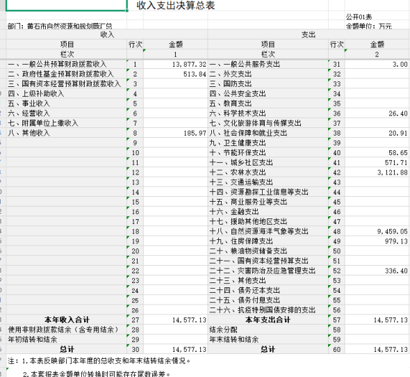2024年度收、支总计均为14577.13万元。与2023年度相比,收、支总计各减少105.53万元,下降0.72 %,主要原因一是较比上年度地质灾害群专结合项目支出减少;二是上年清算了我局事业单位人员2020-2023年度机关工人和事业单位人员单列核定绩效工资。