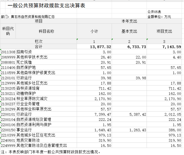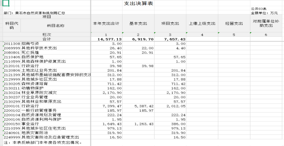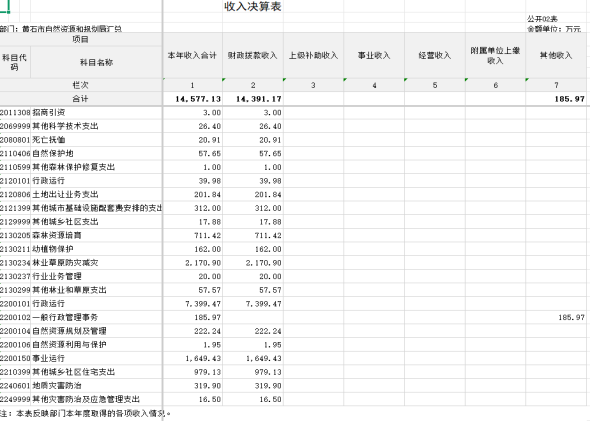 14.自然资源海洋气象等支出(类)自然资源事务(款)自然资源规划及管理(项)。年初预算为0万元,支出决算为222.24万元,完成年初预算的100%,支出决算数大于年初预算数的主要原因:追加预算用于付黄石市流域综合治理和统筹发展规划及实验细则。
