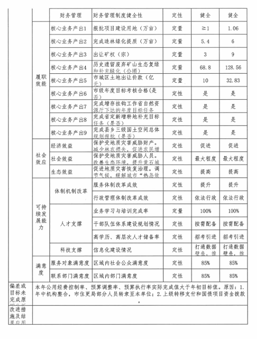 发现的问题及原因:一是项目成果待上级部门审批,导致目标值部分完成。如:“国土空间城市体检尚未能过规委会审查”;二是根据上级部门工作安排,耕地保护和部分空间规划等项目调整,导致指标值变动或不(待)实施。如:调增指标“补充更新永久基本农田储备区数据、更新永久基本农田数据库100%”等,取消指标“黄石市都市区总体城市设计方案文本6套”、“黄石市生态保护红线勘界定标设计方案文本6套”等;三是因客观不可控原因导致指标值完成偏离。如:全国工程建设市场大环境低迷、人工成本上涨等致使“大比例尺地形图缩编更新范围10平方公里”、“测量标志托管费标准200元/个/年”。
