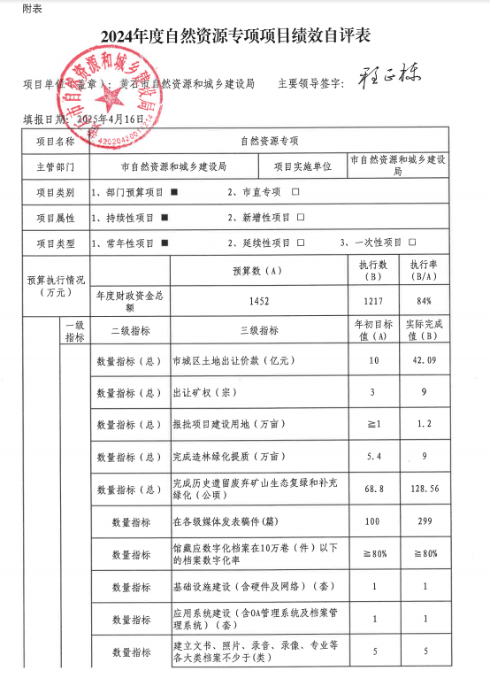 1.自然资源专项项目绩效自评综述:项目全年预算数为 1452万元,执行数1217万元,完成预算84%。主要产出和效益:一是经济效益指标,落实中央和省、市关于统一行使全民所有自然资源资产所有者职责和所有国土空间用途管制职责;二是社会效益指标,优化营商环境,拓展城市发展空间,促进黄石地方经济高质量发展,优化营商环境,拓展城市发展空间,促进黄石地方经济高质量发展;三是可持续影响指标,制度、经费保障,加强自然资源管理和开发利用;四是具体指标,区域内社会公众满意度。