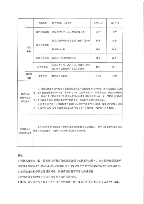 项目绩效自评综述:项目全年预算数为399万元,执行数为386万元,完成预算96.7%。主要产出和效益:一是2024年受理的4.84万卷不动产登记档案得到了整理;二是全年发放不动产证书登记证明(含电子)5.74万份;三是邮寄不动产登记证书证明10508本;四是继续推动优化营商环境工作,群众可多途径(一事联办、银行网办、网厅办)申请办理不动产登记事项。实现信息多跑路,让群众少跑路目标,提升了群众办事便利度;五是非税收入方面。全年不动产登记费缴存629万元;六是继续优化办事流程,压缩办事时限,实现一般登记1个工作日可办结,个人新购商品房转移登记、个人存量房转移登记等高频事项1个小时办结。