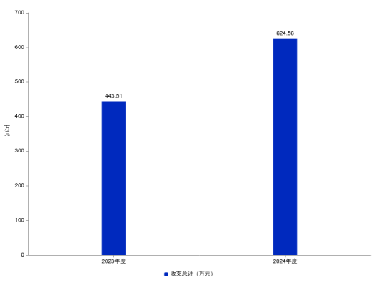 2024年度收、支总计均为624.56万元。与2023年度相比,收、支总计增加181.05万元,增长40.8%,主要原因是:1、单位有人员变动,薪资、社保调整,增加了人员及公用经费支出;2、解决历史遗留人员黄罗历年工资福利费用;3、用于劳务派遣人员劳务费。