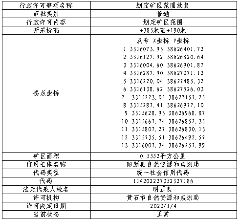 湖北省阳新县马岭塘矿区建筑石料用石灰岩矿采矿权划定矿区范围行政许可信息公示