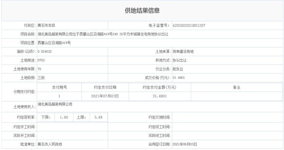 湖北美岛服装有限公司位于西塞山区沿湖路419号240.32平方米城镇住宅用地协议出让