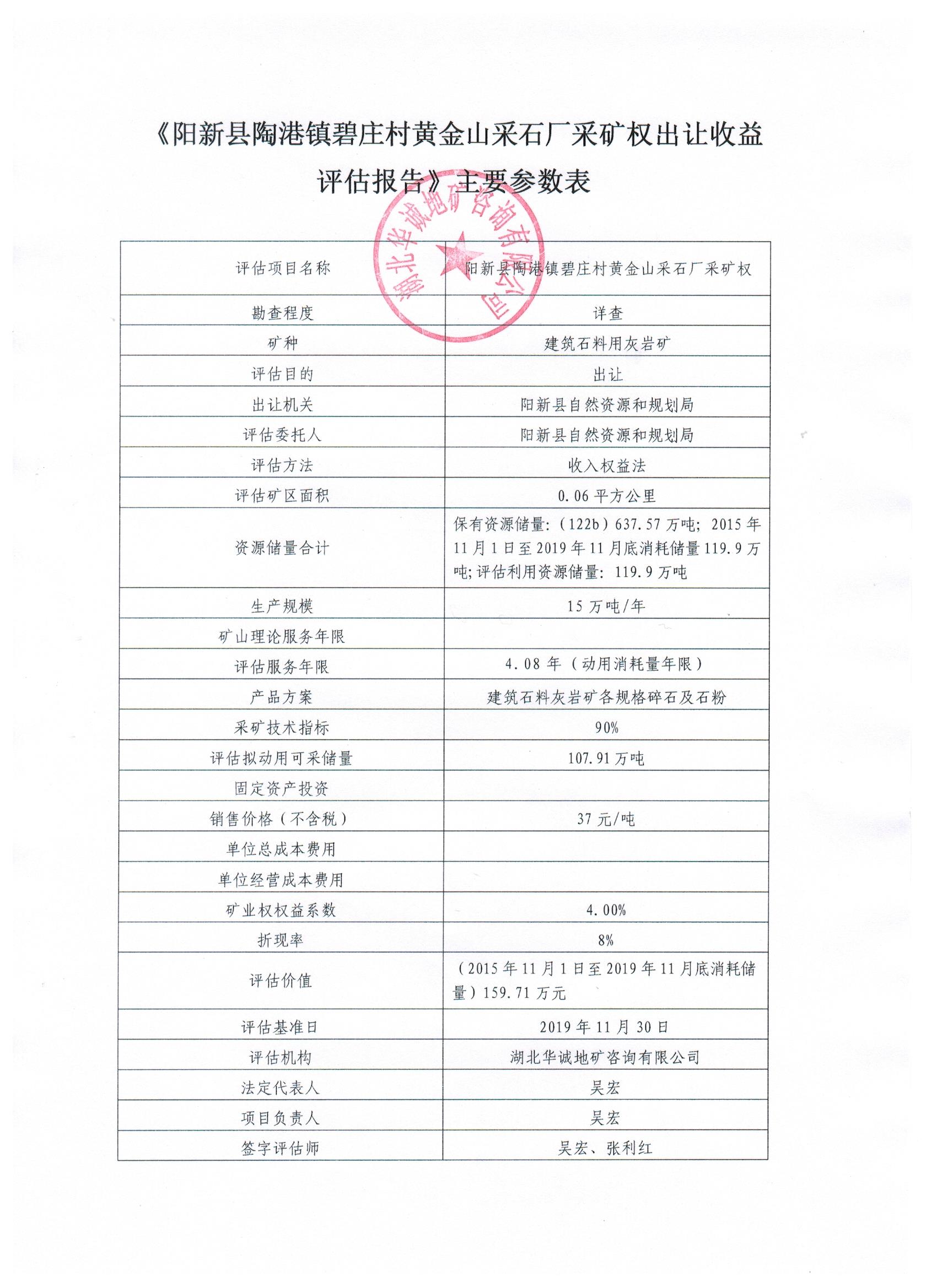 根据《省国土资源厅关于做好矿业权价款评估备案核准取消后有关工作的通知》(鄂土资规〔2015〕2号)、《阳新县国土资源局关于启动县级发证采矿权出让收益(价款)评估工作的通知》(阳土资办函〔2018〕6号)要求,现将《阳新县陶港镇碧庄村黄金山采石厂采矿权出让收益评估报告》进行第一次公示: