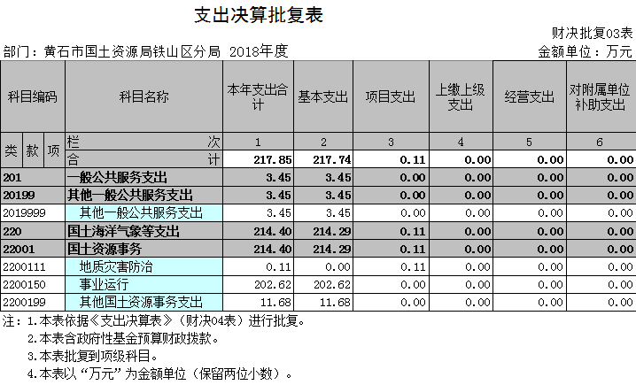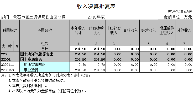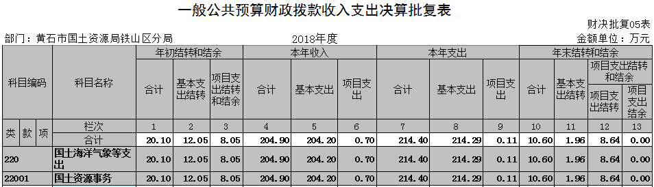 部门2018年预算收支情况:预算收入1974800元,预算支出1974800元。其中人员经费1738400元,日常公用经费236400元。预算追加收入74226元。其中追加公用经费(新增人员、离退休人员)4300元,追加人员经费(新增人员、离退休人员)45510元,2018年下半年人员经费17416元,2018年地质灾害监测经费7000元,共计74226元。