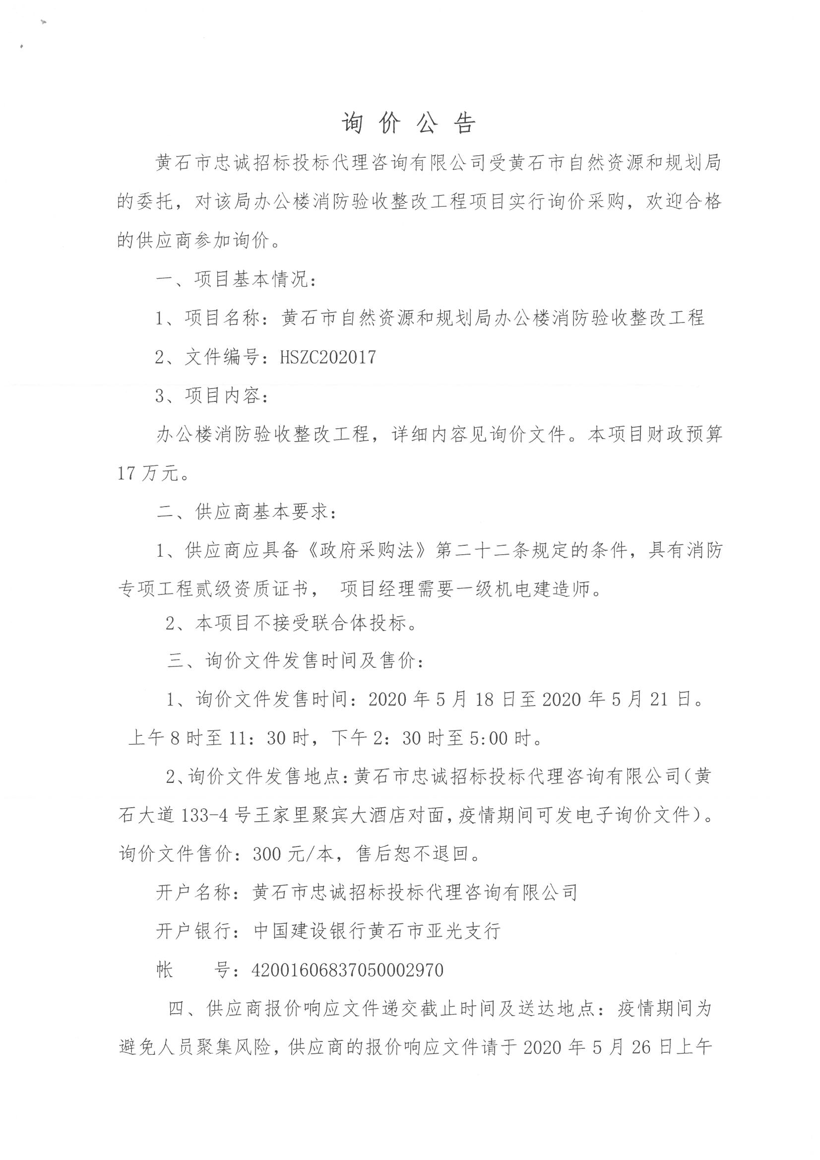 黄石市自然资源和规划局办公楼消防验收整改工程询价公告